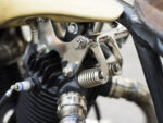 Aus Messing entstanden der Tank – mitsamt integriertem Ölgefäß – der Fender und das Herzstück, die hausgemachte Springergabel. Die ließen die Italiener künstlich altern, der »Used-Look« ist ein Steckenpferd der Oldschool-Spezialisten. Auch der nach unten gebogene Lenker war eine Pflichtaufgabe, ein Boardtracker darf dem Fahrer nie eine andere Haltung geben, als die nach unten gebeugte. Die Griffe sind lederumwickelt, mit Draht fixiert, alles wie damals. Mehr gibt es zu diesem Bike nicht zu sagen, denn mehr ist nicht dran. Wie bei einem guten Burger, ihr erinnert euch.