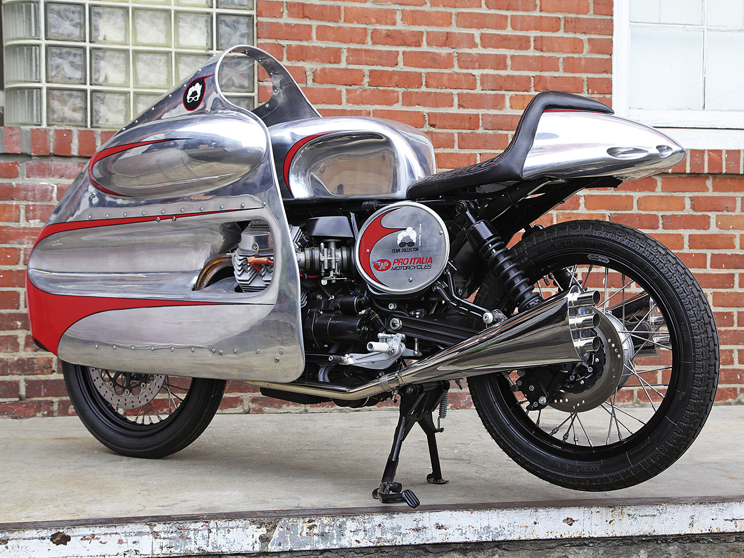 Also besorgte sich Barry eine 2009er Moto Guzzi V7 und brachte diese zum kalifornischen Spezialisten Pro Italia nach Glendale. Hier wurde das Bike auf Highspeed getrimmt. Zurückverlegte Fußrasten, tief angeschellte Stummellenker, schmale 18-Zoll-Sun-Räder und Sachs-Federbeine sollten den Grundstock für dieses außergewöhnliche Bike bilden. Der 90°-V2 mit 750 ccm blieb serienmäßig, erhielt aber die spacigen Ray-Gun-Auspuffschalldämpfer einer BSA Rocket 3 mit ihren drei kleinen Röhrchen am Ende. Passt.